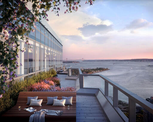 Designed by FXCollaborative with interiors envisioned by Deborah Berke Partners, 77 Greenwich provides an abundance of light that floods each of the homes thanks to the building’s pleated glass curtain wall façade. These floor-to-ceiling windows provide residents with views not often associated with New York City living: the river, sunsets, and boats gliding by on New York Harbor.