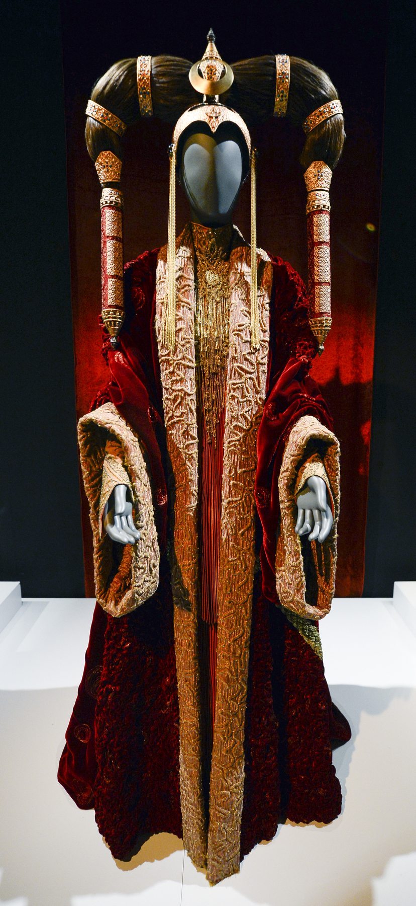 Symbolism and military power so prevalent in “Star Wars” costumes of faceless Stormtroopers is presented in a mirrored gallery that creates an illusion of numerous militias. Stepping into the next gallery visitors will get lost in the power dynamics played out in the costume creation inspired by military officers from Nazi Germany or heroic American astronauts, everything is traced back to a real life referent and shows how power can be effused and costumes can make characters come alive. Fans will gasp at the “Devolving Palpatine” gallery, as the evolution of costume demonstrates the character’s turn to evil, first in a reptilian robe, and finally as a satanic red crotchety-looking monster, with the mannequins changing their shapes under the robes as well.