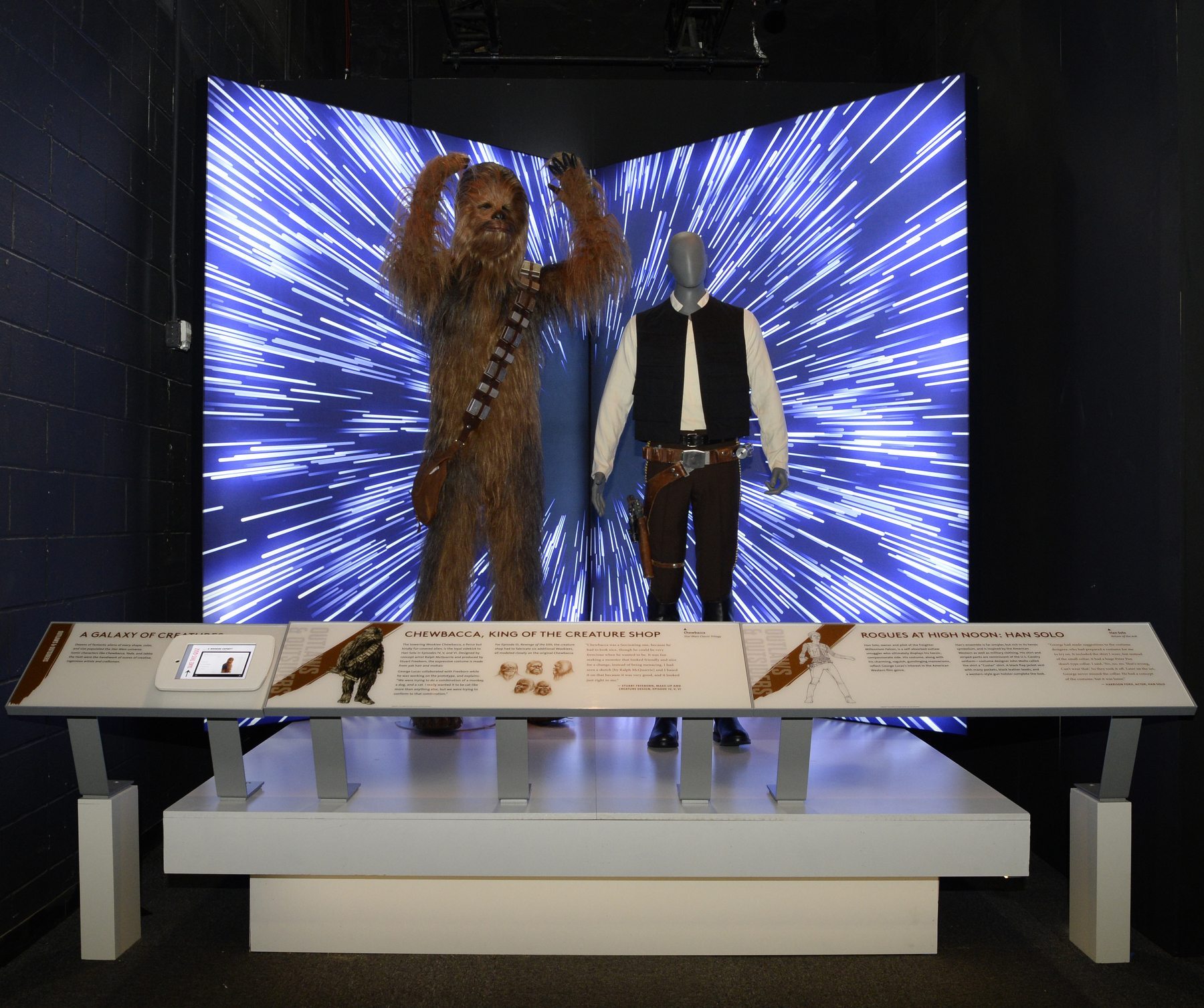 When the screen fades to black, a massive vault door opens up into the first chapter of the interactive storytelling, told through the expressive power of costumes. Dressing a Galaxy is an exhilarating yet sometimes challenging affair, as the visitors learn by checking out Queen Amidala’s famous scarlet Throne Room Gown. In Smithsonian tradition, the costume is a story in itself, supplying the words even without the actor’s presence. The rich color coupled with intricate detailing symbolize royalty, opulence, and a rich society, as opposed to Obi-Wan Kenobi’s Jedi Robes, the burlap-looking simple silk, representing a different time of sparsity and a struggling society. The dress’s bottom is decorated with light up globes, which were operated by a battery that Natalie Portman, the actress playing the character, was holding between her legs. The electronic flipbook, like many throughout the show, tells this anecdote that explains Portman’s limited amount of movement in the film.