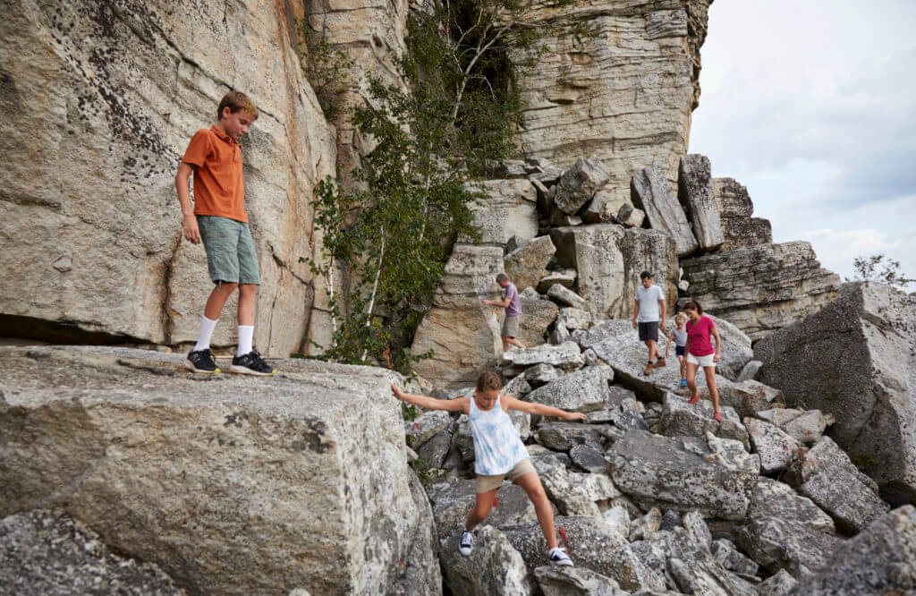 Because the weather was still cool, we decided to eschew the rowboats and kayaking and thought about beginning a hike. But with over 85 miles of trails meandering around the property, we decided to save it for the next morning. To the left of the lake is a jumble of prehistoric-looking rocks, which after closer scrutiny turned out to be a combination of a climb/hike called the Rock Scramble.