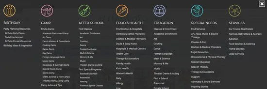 For a deeper dive into the site and to find more specific listings, use our new “megamenu,” the “Search Categories” link at the top left of the page (“menu” on mobile). There you will find virtually our entire category listings, from specific sports to special needs resources to summer camp options.