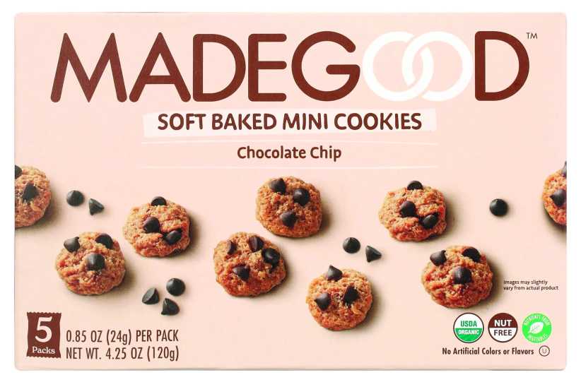 MadeGood Chocolate Chip Soft Baked Mini Cookies are thoughtfully created to keep the familiar taste of chocolate chip cookies while also creating an organic product free from nine common allergens, artificial colors, or flavors. Soft-baked and bite-sized, these are a delicious alternative to regular overprocessed cookies. They are available at most retail stores and at madegoodfoods.com.