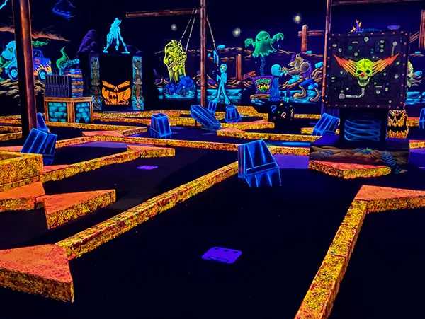Upon entering Monster Mini Golf, all perceptions of traditional mini golf will be spirited away by the indoor, 18-hole, monster-themed, glow-in-the-dark miniature golf course! Deer Park and Garden City locations invite guests to experience a host of family-oriented fun activities. Whether visiting for the first time or the one hundredth, mini-golfers feel the excitement and adventure of playing mini golf amidst spooktacular monsters and custom, glow-in-the-dark, hand-painted artwork. While testing their skill on the fairways, lively music flows over the course from the unique “WEIRD Radio” station, and an interactive DJ entertains golfers with contests, awarding cool prizes for the wackiest reasons. While the course is challenging enough for adults, it is also quite playable for children.