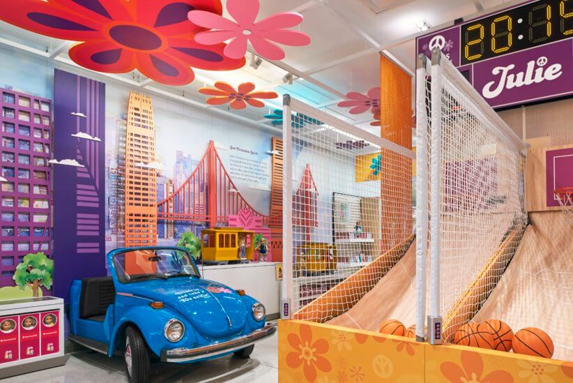 Another installation at American Girl commemorates Julie Albright, one of American Girl’s most popular historical characters from the 1970s. In Julie’s Groovy World, girls are invited to boogie down in the interactive space – whether hanging out in a 70’s-inspired bedroom to scoring points at the Pop-A-Shot basketball game, Julie’s favorite sport and Title IX moment!